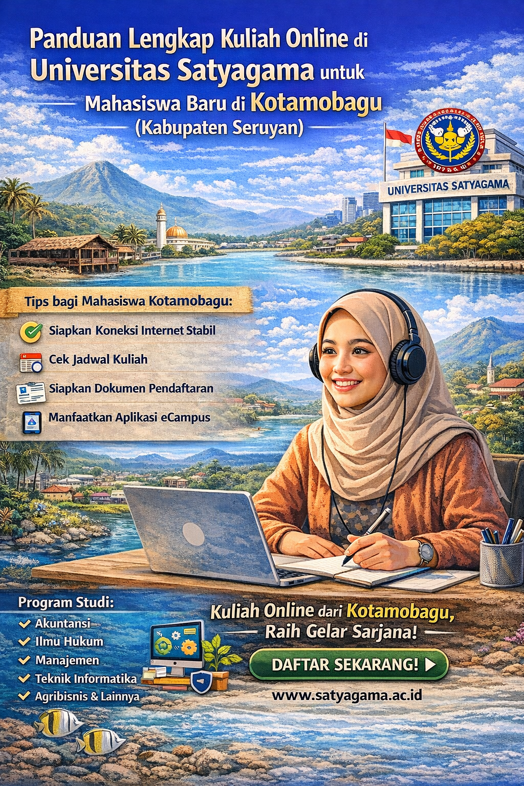 Kuliah Online di Universitas Satyagama untuk Mahasiswa Baru di Kotamobagu (Kabupaten Seruyan)Perkembangan pendidikan tinggi di Indonesia kini semakin dinamis. Tidak hanya perkuliahan tatap muka di kam...